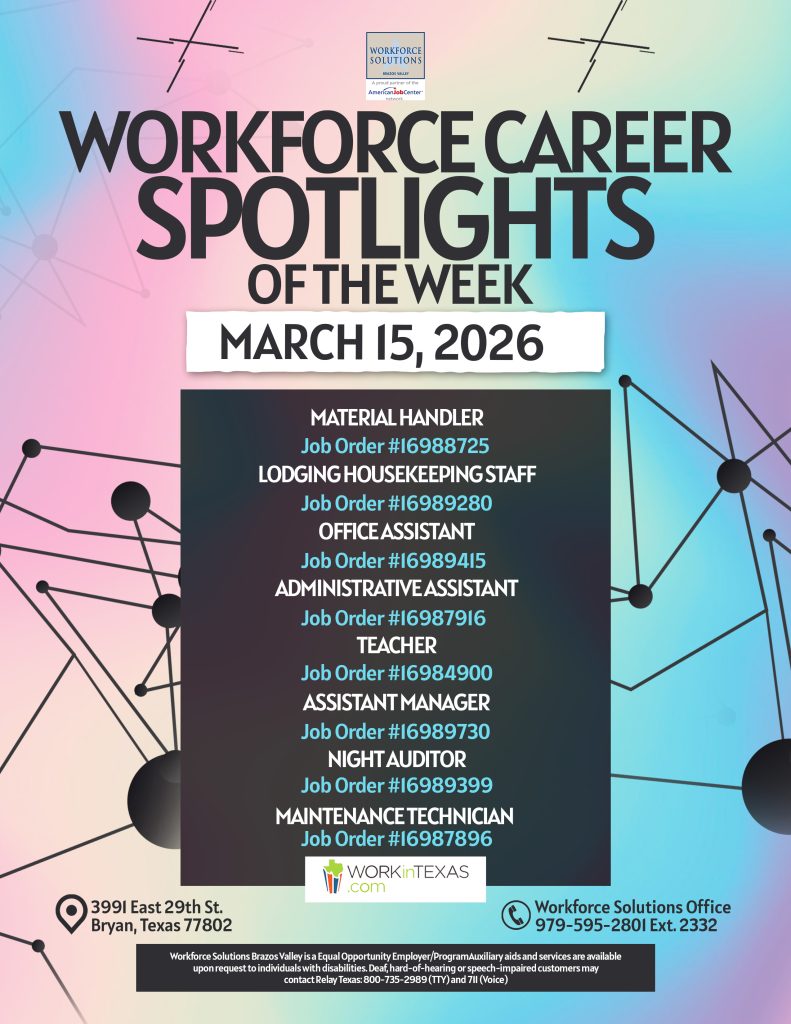 Check out this week’s Workforce Career Spotlights featuring hot new job openings across the Brazos Valley!