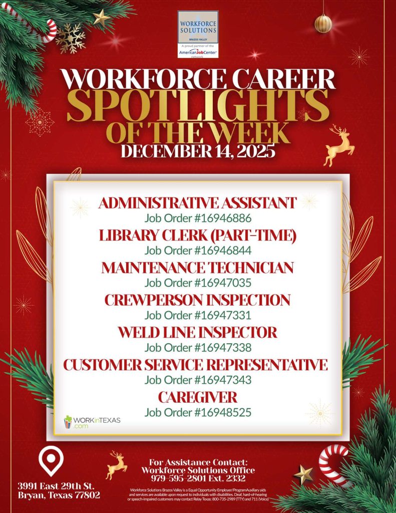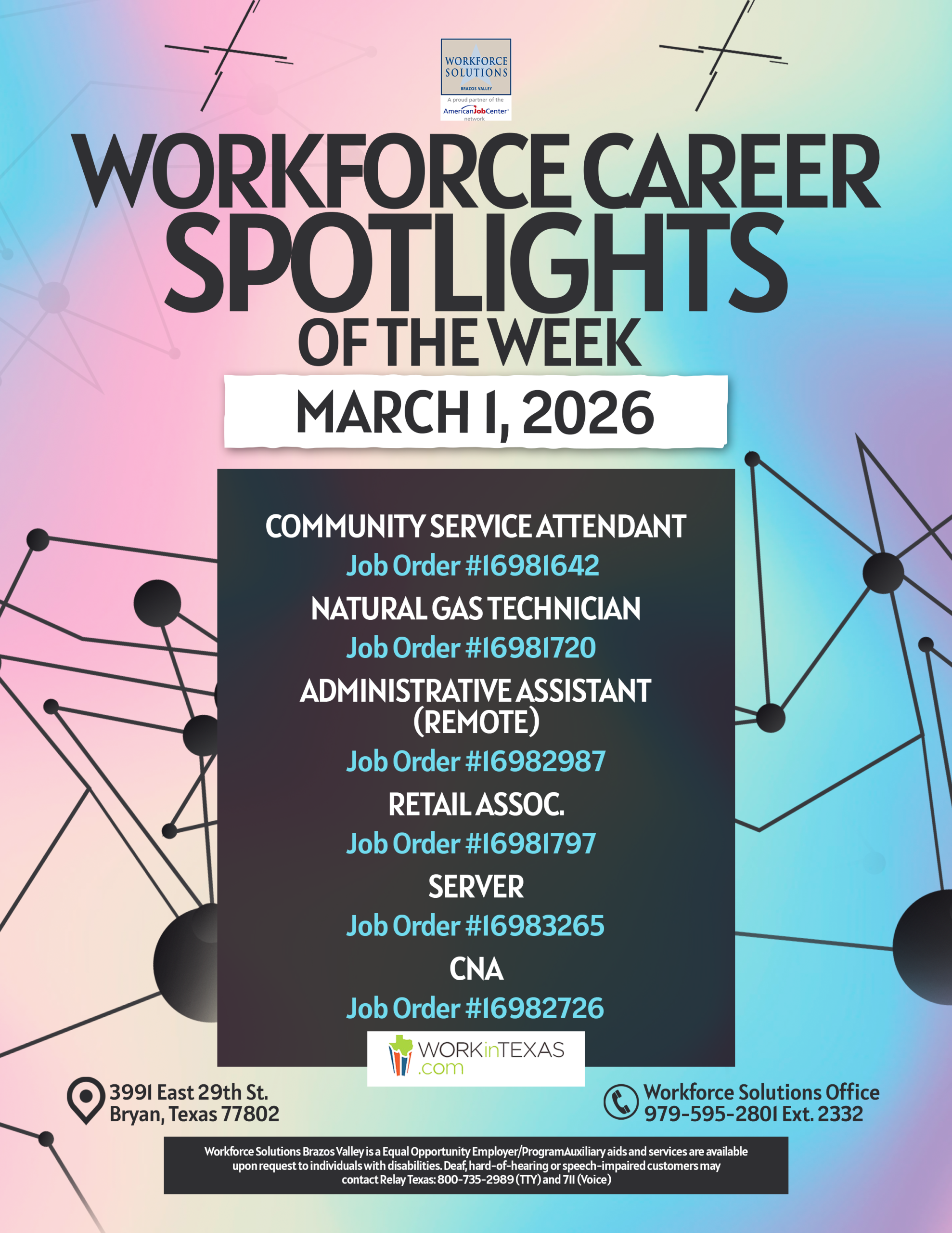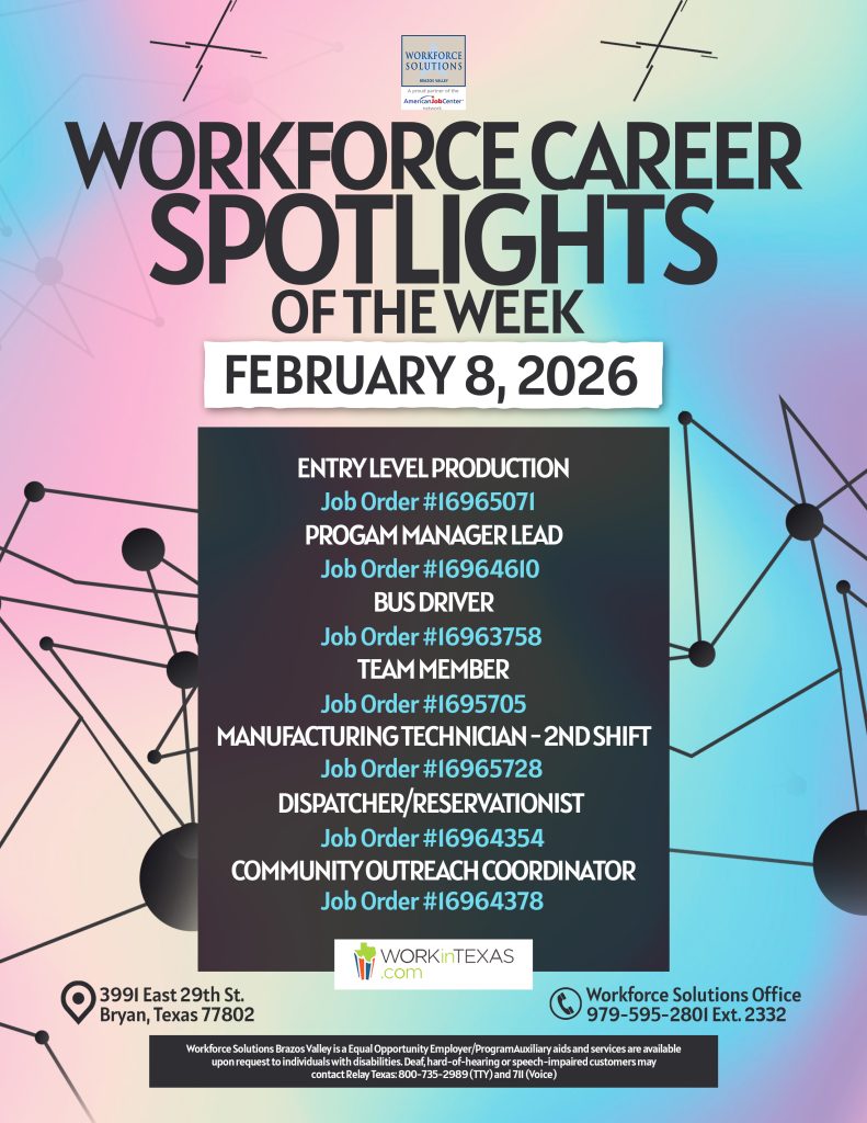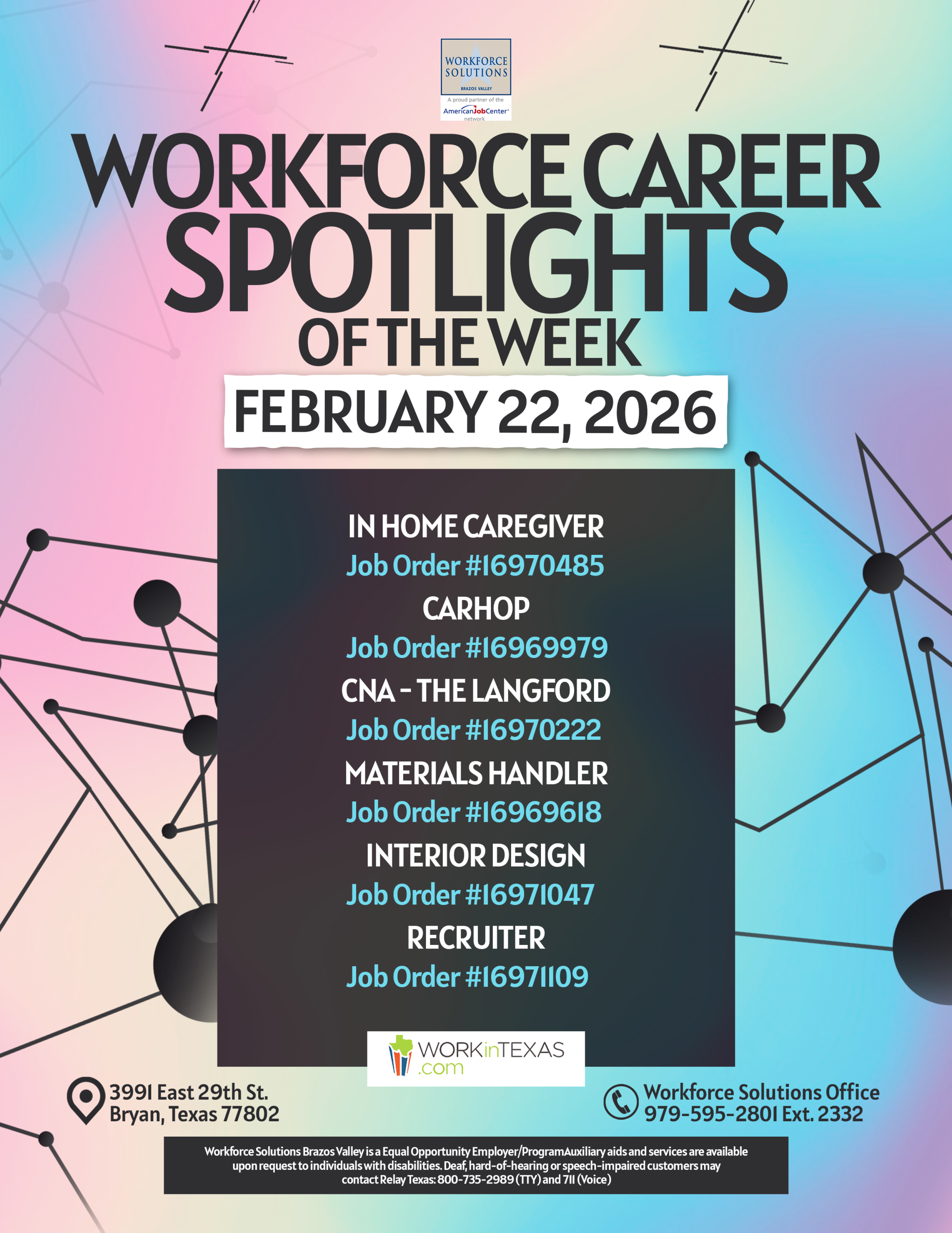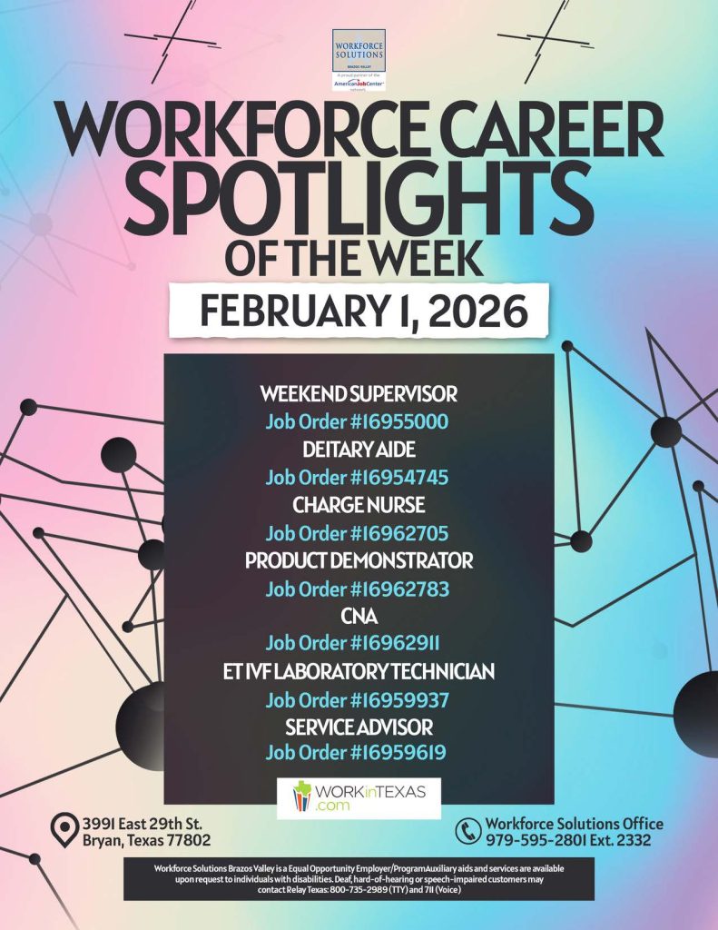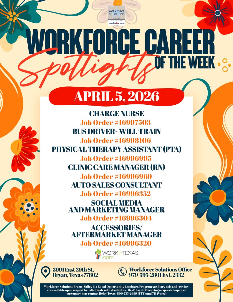 Check out this week’s Workforce Career Spotlights featuring hot new job openings across the Brazos Valley!