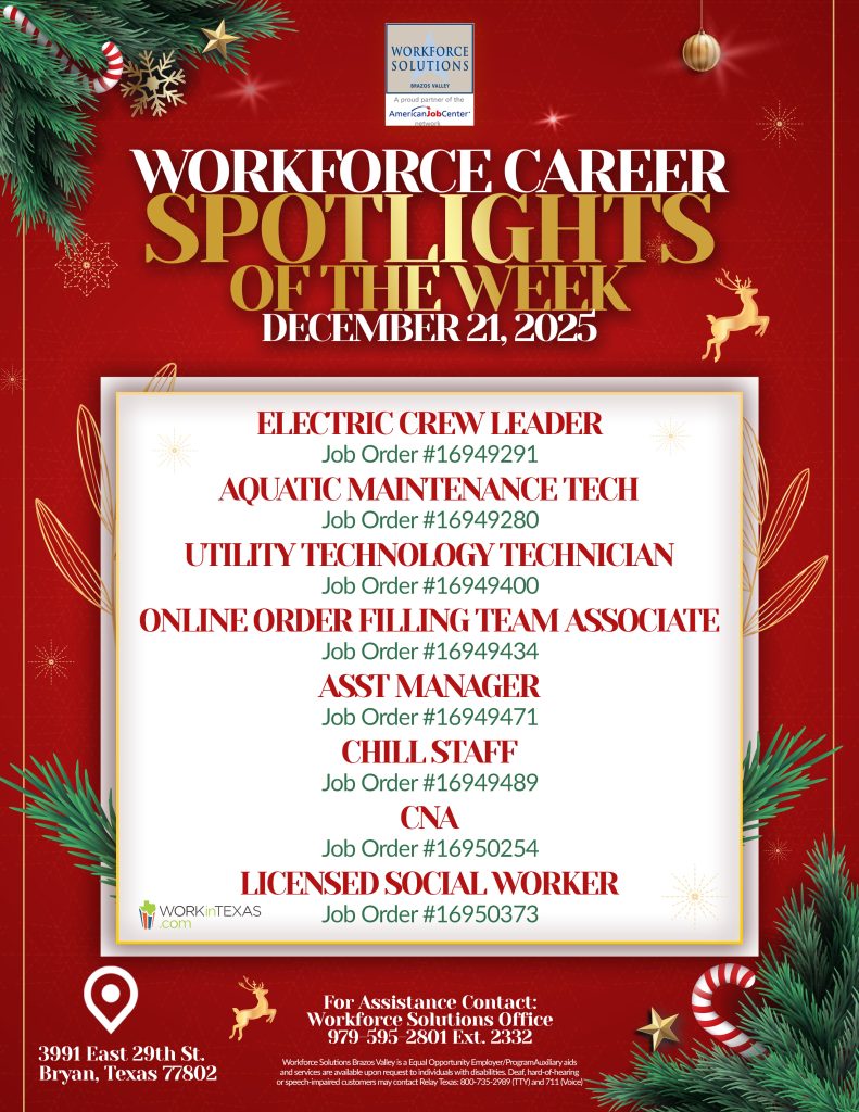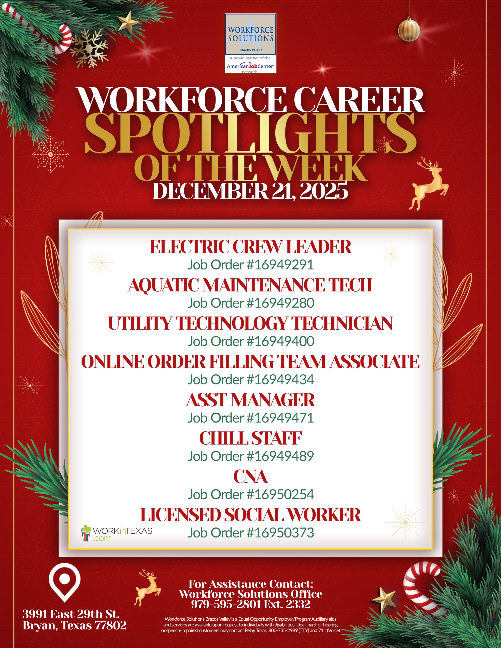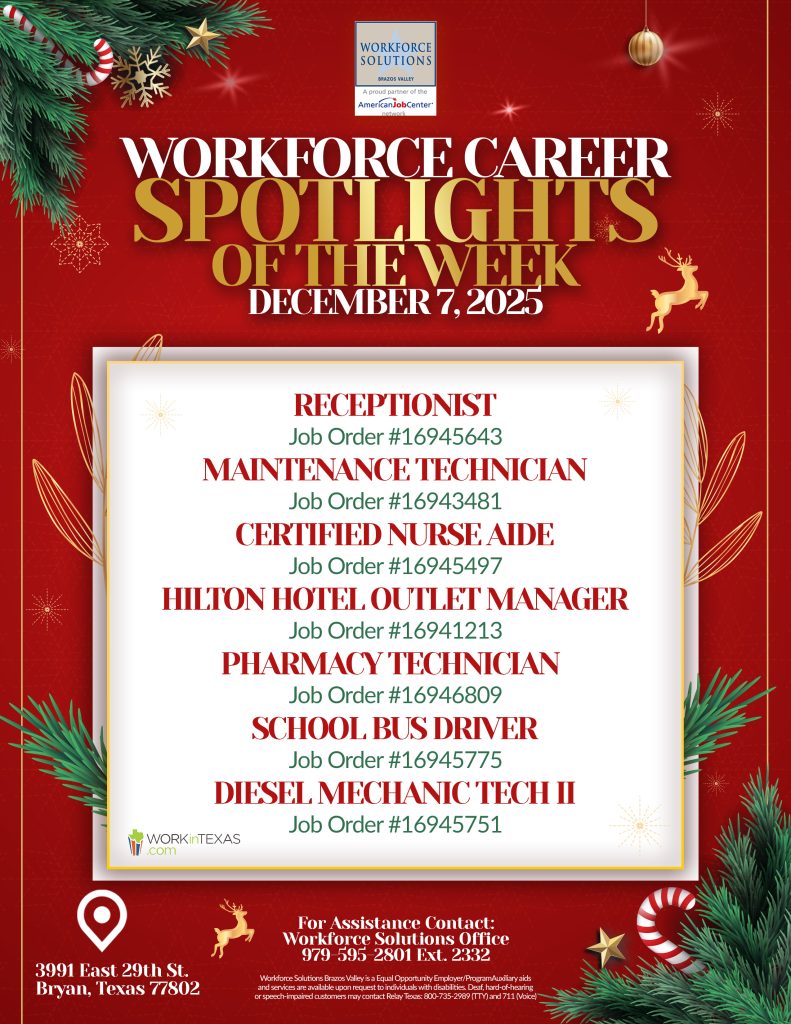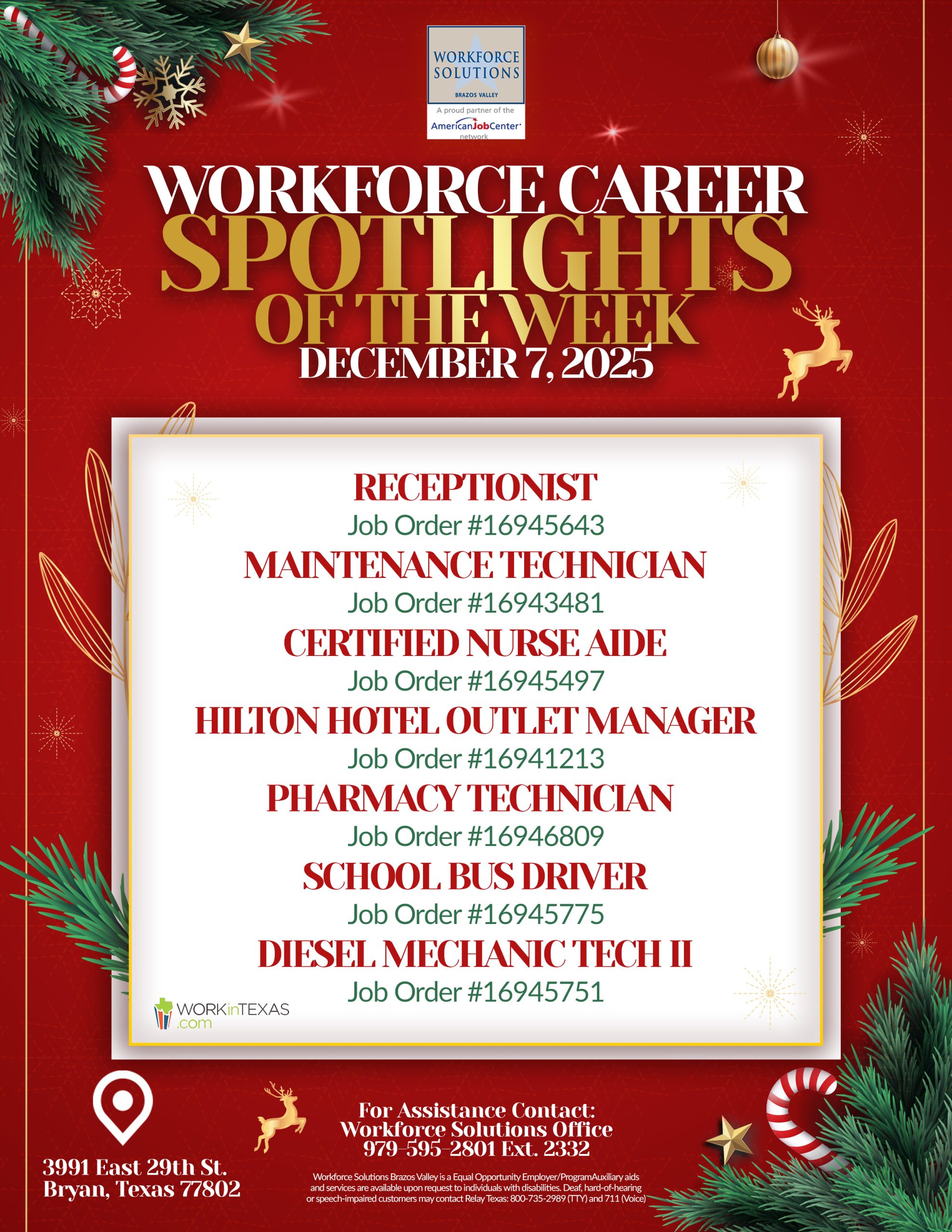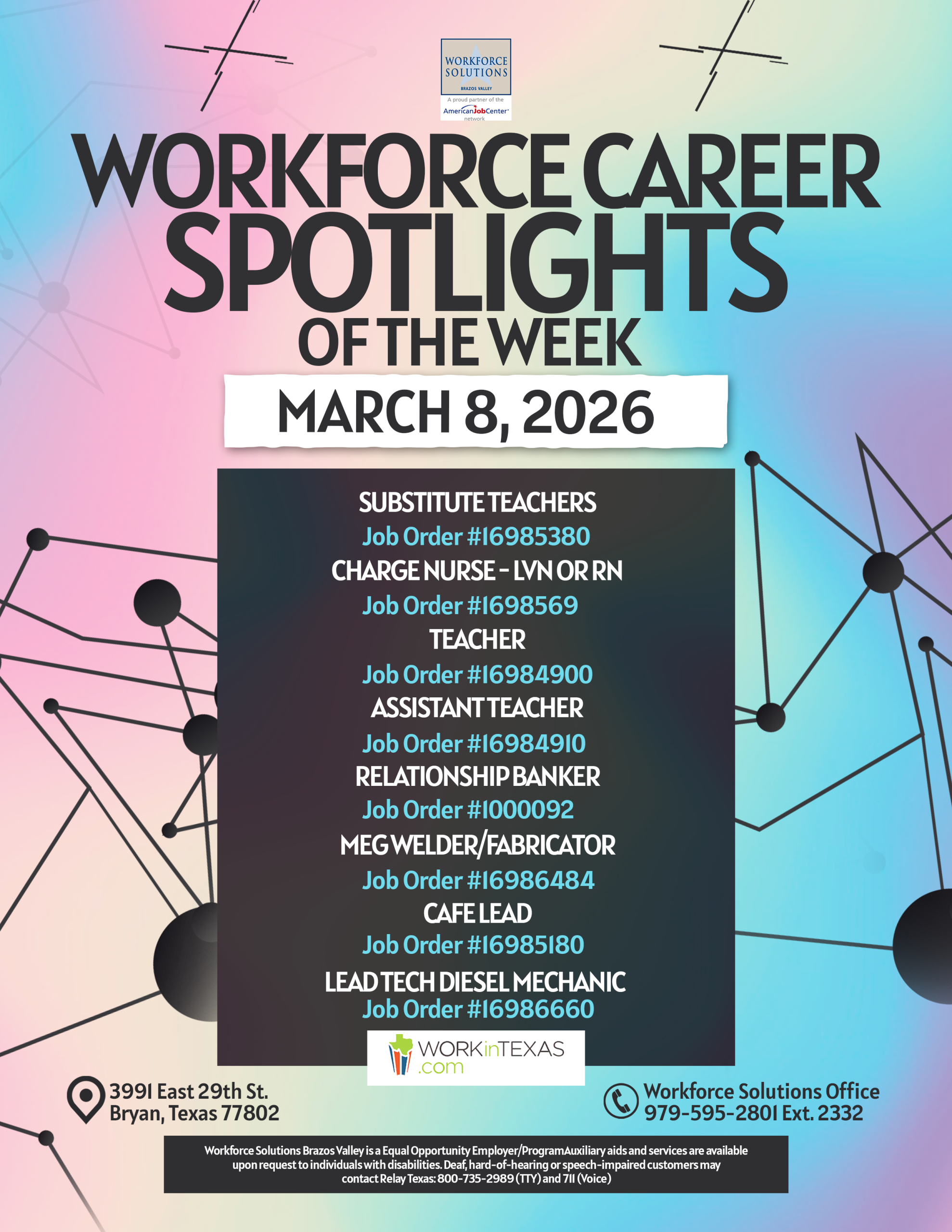 Check out this week’s Workforce Career Spotlights featuring hot new job openings across the Brazos Valley!