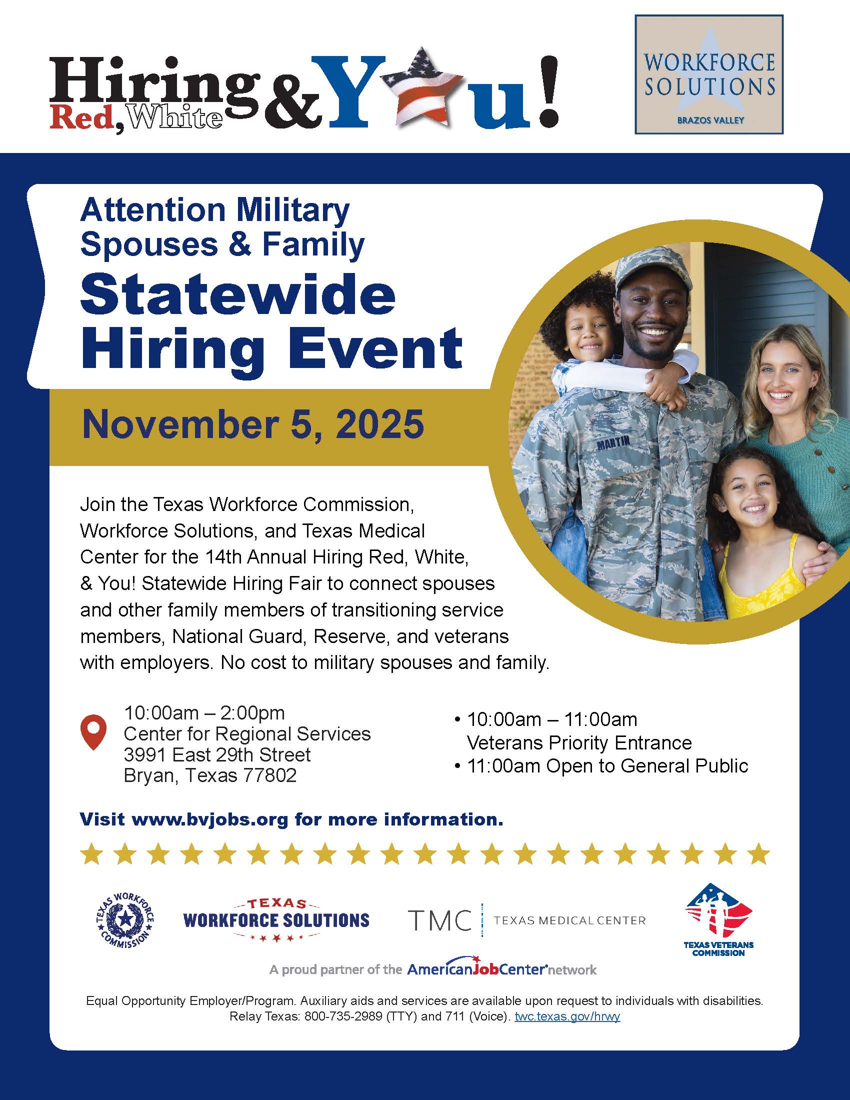 Location: Center for Regional Services at 3991 East 29th Street, Bryan, TX 77802